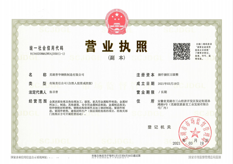 蕪湖普華鋼鐵制造有限公司成立于2021年03月19日,位于安徽省蕪湖市三山經(jīng)濟(jì)開發(fā)區(qū)保定街道孫灘路9號(hào),地理位置優(yōu)越,交通便利,是一家集高標(biāo)準(zhǔn)緊固件生產(chǎn)、科研、銷售于一體的集團(tuán)化企業(yè)。 蕪湖普華鋼鐵制造有限公司是一家專業(yè)生產(chǎn)、加工、銷售:精...